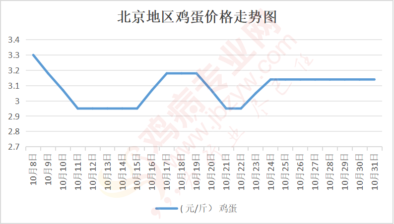 鸡病专业网消息:10月31日,北京大洋路鸡蛋主流批发价格138-139元/44斤,稳,到货7台,成交灵活,走货一般;回龙观鸡蛋138元/44斤,稳;顺义石门鸡蛋138元/44斤,稳。