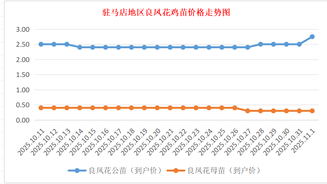 良凤花鸡苗:公苗到户价2.50-3.00元/羽,涨;母苗到户价0.30元/羽,稳。