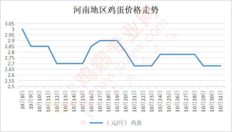 鸡病专业网消息:10月31日,河南郑州鸡蛋2.7元/斤,稳;新密鸡蛋2.7元/斤,稳;荥阳鸡蛋2.7元/斤,稳;中牟鸡蛋2.7元/斤,稳;周口鸡蛋2.65元/斤,稳;商丘鸡蛋80-81元/30斤,稳;鹤壁鸡蛋2.65元/斤,稳;汝州鸡蛋2.65元/斤,稳;开封鸡蛋80-81元/30斤,稳;漯河鸡蛋2.65元/斤,稳;漯河临颍鸡蛋2.65元/斤,稳;许昌鸡蛋2.7元/斤,稳;南阳鸡蛋2.65元/斤,稳;南阳邓州鸡蛋2.65元/斤,稳;新乡鸡蛋2.65元/斤,稳;安阳鸡蛋2.65元/斤,稳;新郑鸡蛋2.7元/斤,稳;登封鸡蛋2.7元/斤,稳;平顶山鸡蛋2.7元/斤,稳;驻马店鸡蛋2.7元/斤,稳;三门峡鸡蛋2.7元/斤,稳;焦作鸡蛋2.65元/斤,稳;信阳鸡蛋2.65元/斤,稳;濮阳鸡蛋2.65元/斤,稳。