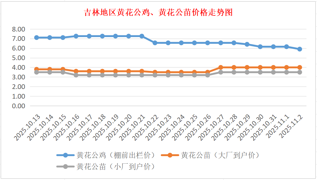 黄花公苗:价格稳定,大厂到户价4.00元/羽,小厂到户价3.50元/羽,稳。