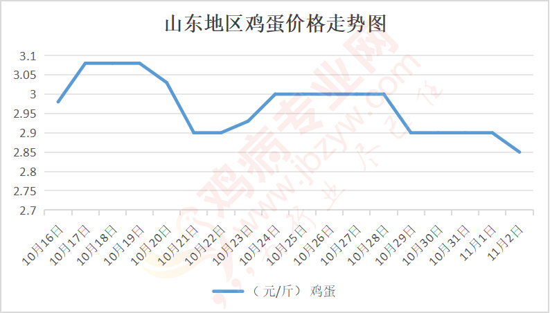 鸡病专业网消息:11月2日,山东地区莱阳鸡蛋2.9元/斤,落;青岛鸡蛋2.9元/斤,落;诸城鸡蛋2.9元/斤,稳;安丘鸡蛋2.8元/斤,稳;昌乐鸡蛋2.8元/斤,稳;寿光鸡蛋2.8元/斤,稳;昌邑鸡蛋2.8元/斤,稳;高密鸡蛋2.9元/斤,稳;青州鸡蛋2.8元/斤,稳;临朐鸡蛋2.8元/斤,稳;莱州鸡蛋2.9元/斤,落;威海鸡蛋2.9元/斤,落;临沭鸡蛋2.8元/斤,稳;沂水鸡蛋2.8元/斤,稳;沂南鸡蛋2.8元/斤,稳;莒南鸡蛋2.8元/斤,稳;兰陵县鸡蛋2.8元/斤,稳;日照鸡蛋2.8元/斤,稳;莒县鸡蛋2.8元/斤,稳;日照辛萁商贸鸡蛋2.8元/斤,稳;泗水鸡蛋价格81元/30斤,稳;济宁、汶上鸡蛋价格81元/30斤,稳;梁山、东平红蛋价格81元/30斤,稳;枣庄滕州地区鸡蛋混码主流到户83元/30斤,稳;泰安地区新泰鸡蛋价格81元/30斤,稳;菏泽地区曹县主流到户81元/30斤,稳;成武鸡蛋价格81元/30斤,稳;单县到户81元/30斤,稳;聊城莘县80元/30斤,稳。
