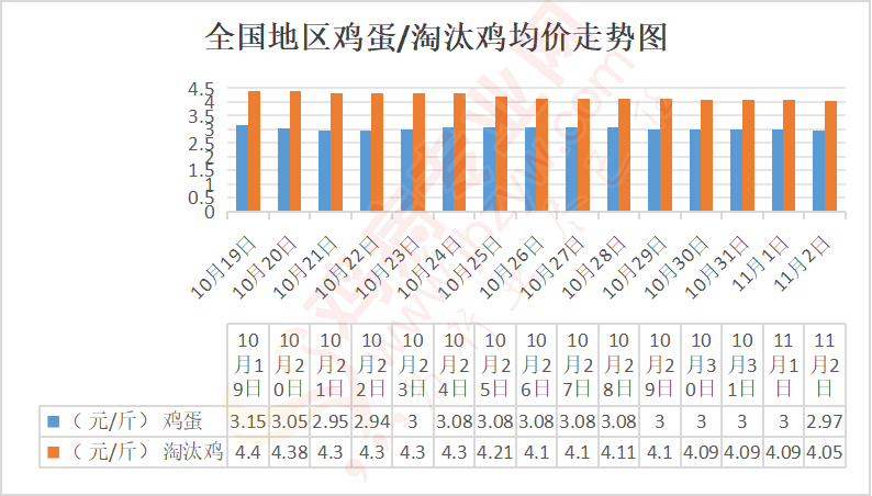 黑龙江地区:伊春鸡蛋3.05-3.1元/斤,淘汰鸡4.3-4.4元/;