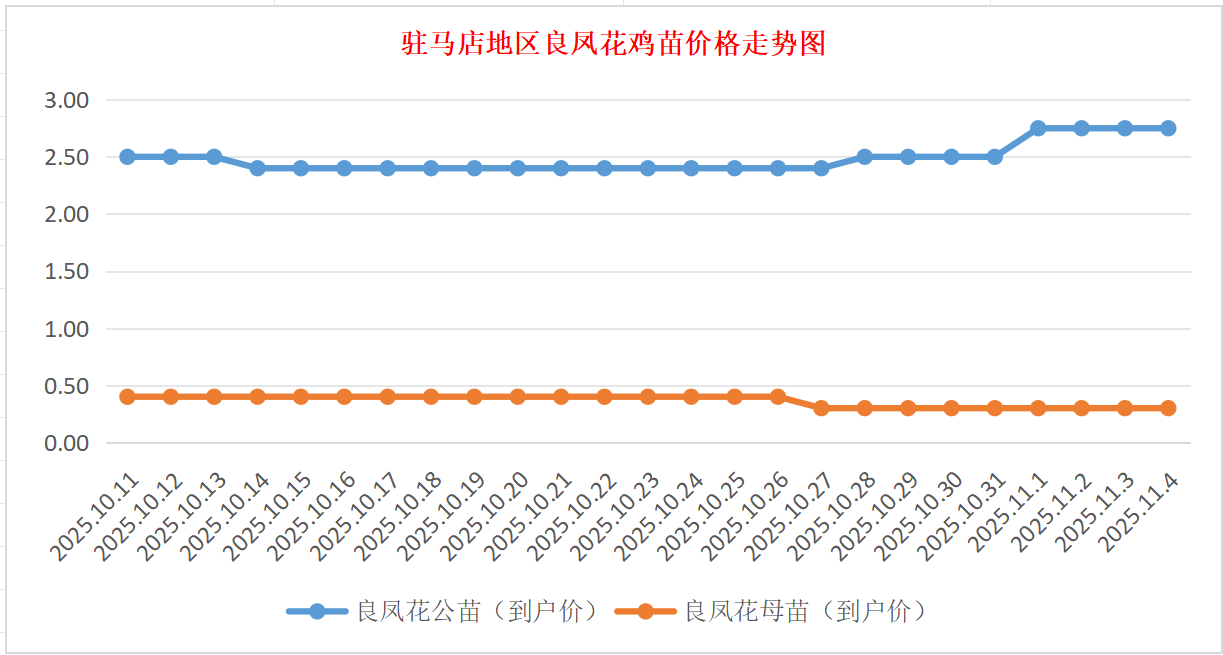 良凤花鸡苗:价格稳定,公苗到户价2.50-3.00元/羽,母苗到户价0.30元/羽,稳。