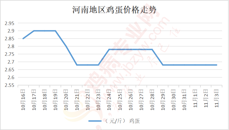 鸡病专业网消息:11月3日,河南郑州鸡蛋2.7元/斤,稳;新密鸡蛋2.7元/斤,稳;荥阳鸡蛋2.7元/斤,稳;中牟鸡蛋2.7元/斤,稳;周口鸡蛋2.65元/斤,稳;商丘鸡蛋80-81元/30斤,稳;鹤壁鸡蛋2.65元/斤,稳;汝州鸡蛋2.65元/斤,稳;开封鸡蛋80-81元/30斤,稳;漯河鸡蛋2.65元/斤,稳;漯河临颍鸡蛋2.65元/斤,稳;许昌鸡蛋2.7元/斤,稳;南阳鸡蛋2.65元/斤,稳;南阳邓州鸡蛋2.65元/斤,稳;新乡鸡蛋2.65元/斤,稳;安阳鸡蛋2.65元/斤,稳;新郑鸡蛋2.7元/斤,稳;登封鸡蛋2.7元/斤,稳;平顶山鸡蛋2.7元/斤,稳;驻马店鸡蛋2.7元/斤,稳;三门峡鸡蛋2.7元/斤,稳;焦作鸡蛋2.65元/斤,稳;信阳鸡蛋2.65元/斤,稳;濮阳鸡蛋2.65元/斤,稳。