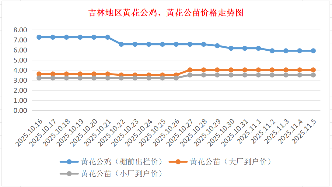 黄花公苗:价格稳定,大厂到户价4.00元/羽,小厂到户价3.50元/羽,稳。