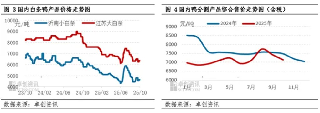 需求方面,从图3及图4可以明显看出,10月以来鸭产品延续偏弱运行趋势,产品价格低位盘整,月底分割品虽有上涨,但月内多数时间下均保持低位。10月大小白条及鸭综合产品售价分别为6.39元/公斤、4.68元/公斤、7.14元/公斤,环比分别为跌1.57%、涨0.96%、跌3.90%。10月产品市场供应增幅有限,需求延续低迷是导致产品价格下跌的关键。展望11月,分割产品考虑部分单品价格触底,贸易商拿货积极性稍有转好,而南方活禽需求主要受季节性及替代品影响,11月猪价或低位回调,而南方腌腊进行,活禽需求或略有转好,对11月毛鸭价格上涨或存在一定需求面利好支撑。