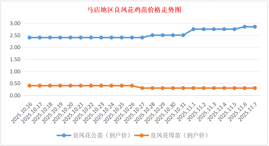 良凤花鸡苗:价格稳定,公苗到户价2.70-3.00元/羽,母苗到户价0.30元/羽,稳。