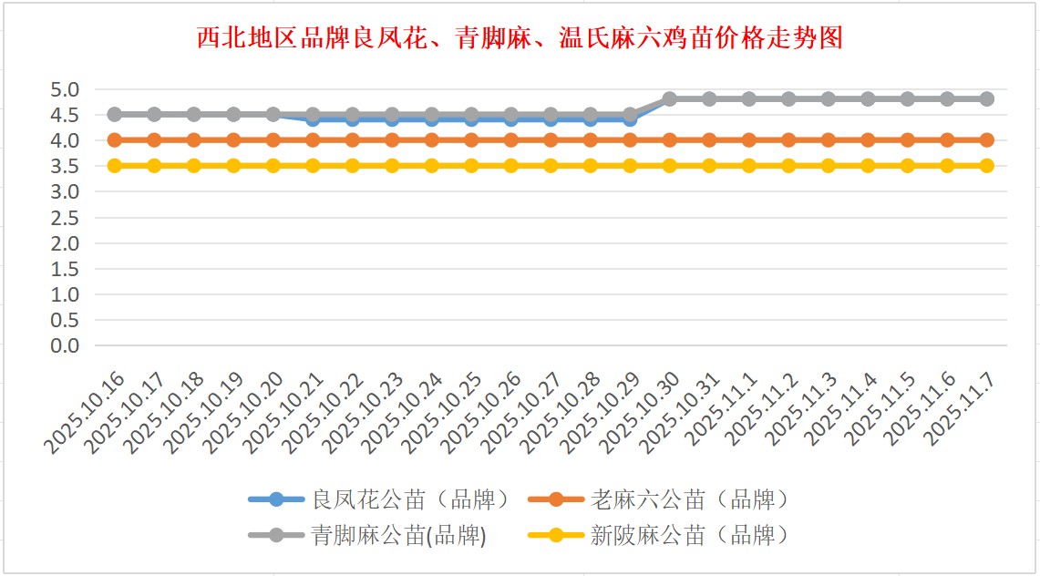 品牌新陂麻:价格稳定,到户价公苗4.50元/羽,稳。