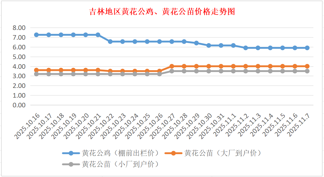 黄花公苗:价格稳定,大厂到户价4.00元/羽,小厂到户价3.50元/羽,稳。