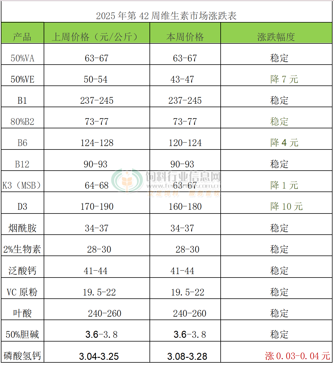 VE:本周VE市场报价43-47元/公斤。欧洲VE市场报价6-6.5欧元/公斤。北沙制药计划7月开始停产检修10-11周。7月部分厂家签单价格小涨。8月7日BASF宣称VE产品解除不可抗力状态。10月15日市场称国内部分厂家停报,市场止跌,购销好转。