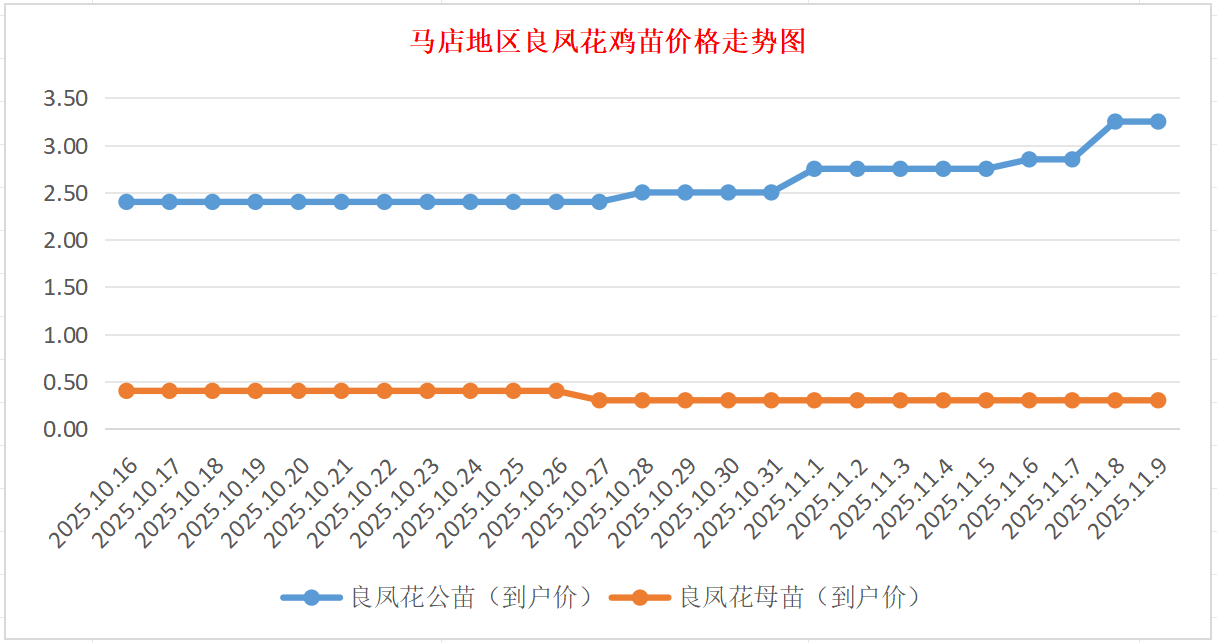 良凤花鸡苗:公苗到户价3.00-3.50元/羽,母苗到户价0.30元/羽,稳。