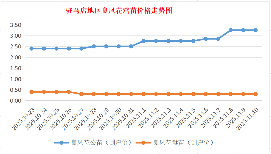 良凤花鸡苗:公苗到户价3.00-3.50元/羽,母苗到户价0.30元/羽,稳。