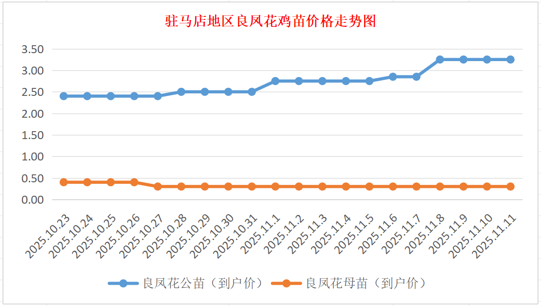 良凤花鸡苗:公苗到户价3.00-3.50元/羽,母苗到户价0.30元/羽,稳。
