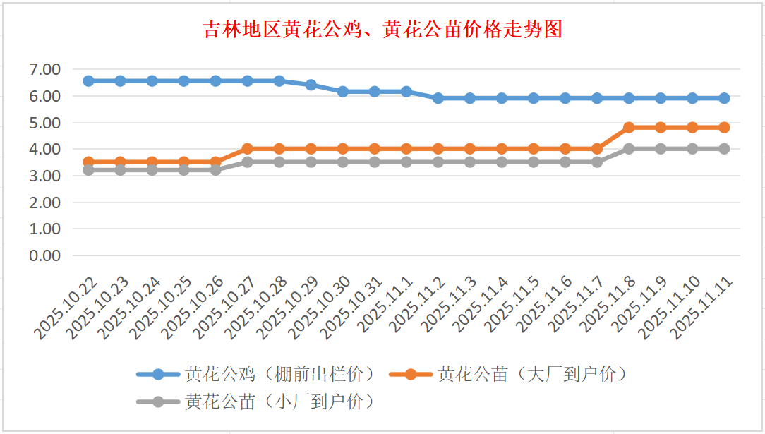 黄花公苗:价格稳定,大厂到户价4.80元/羽,小厂到户价4.00元/羽,稳。