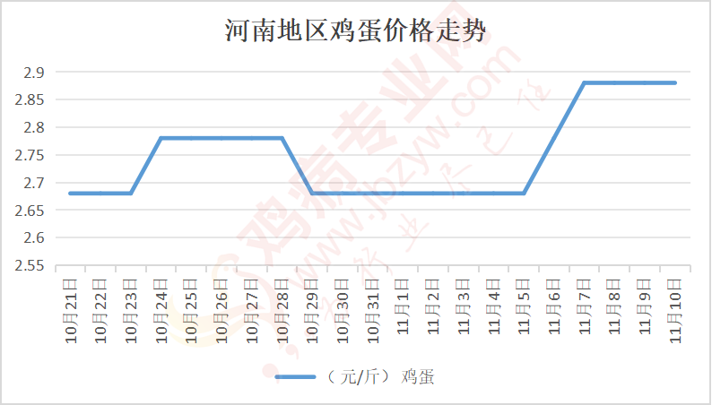 鸡病专业网消息:11月10日,河南郑州鸡蛋2.9元/斤,稳;新密鸡蛋2.9元/斤,稳;荥阳鸡蛋2.9元/斤,稳;中牟鸡蛋2.9元/斤,稳;周口鸡蛋2.85元/斤,稳;商丘鸡蛋87元/30斤,稳;鹤壁鸡蛋2.85元/斤,稳;汝州鸡蛋2.85元/斤,稳;开封鸡蛋86-87元/30斤,稳;漯河鸡蛋2.85元/斤,稳;漯河临颍鸡蛋2.85元/斤,稳;许昌鸡蛋2.9元/斤,稳;南阳鸡蛋2.85元/斤,稳;南阳邓州鸡蛋2.85元/斤,稳;新乡鸡蛋2.85元/斤,稳;安阳鸡蛋2.85元/斤,稳;新郑鸡蛋2.9元/斤,稳;登封鸡蛋2.9元/斤,稳;平顶山鸡蛋2.9元/斤,稳;驻马店鸡蛋2.9元/斤,稳;三门峡鸡蛋2.9元/斤,稳;焦作鸡蛋2.85元/斤,稳;信阳鸡蛋2.85元/斤,稳;濮阳鸡蛋2.85元/斤,稳。