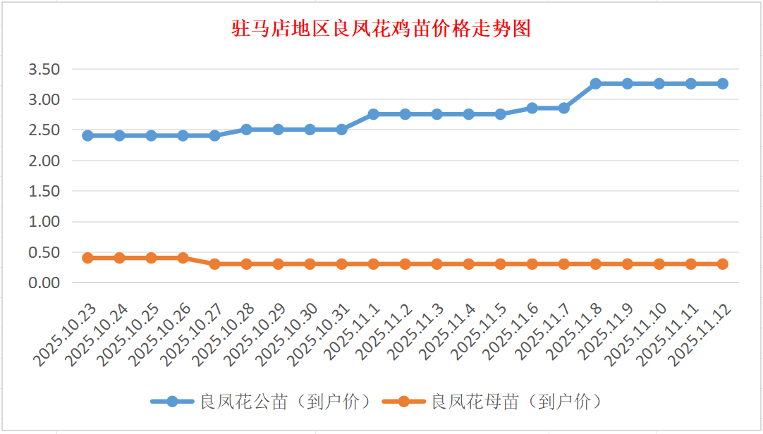 良凤花鸡苗:公苗到户价3.00-3.50元/羽,母苗到户价0.30元/羽,稳。