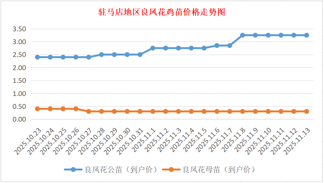 良凤花鸡苗:公苗到户价3.00-3.50元/羽,母苗到户价0.30元/羽,稳。