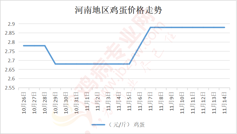 鸡病专业网消息:11月14日,河南郑州鸡蛋2.9元/斤,稳;新密鸡蛋2.9元/斤,稳;荥阳鸡蛋2.9元/斤,稳;中牟鸡蛋2.9元/斤,稳;周口鸡蛋2.85元/斤,稳;商丘鸡蛋87元/30斤,稳;鹤壁鸡蛋2.85元/斤,稳;汝州鸡蛋2.85元/斤,稳;开封鸡蛋86-87元/30斤,稳;漯河鸡蛋2.85元/斤,稳;漯河临颍鸡蛋2.85元/斤,稳;许昌鸡蛋2.9元/斤,稳;南阳鸡蛋2.85元/斤,稳;南阳邓州鸡蛋2.85元/斤,稳;新乡鸡蛋2.85元/斤,稳;安阳鸡蛋2.85元/斤,稳;新郑鸡蛋2.9元/斤,稳;登封鸡蛋2.9元/斤,稳;平顶山鸡蛋2.9元/斤,稳;驻马店鸡蛋2.9元/斤,稳;三门峡鸡蛋2.9元/斤,稳;焦作鸡蛋2.85元/斤,稳;信阳鸡蛋2.85元/斤,稳;濮阳鸡蛋2.85元/斤,稳。