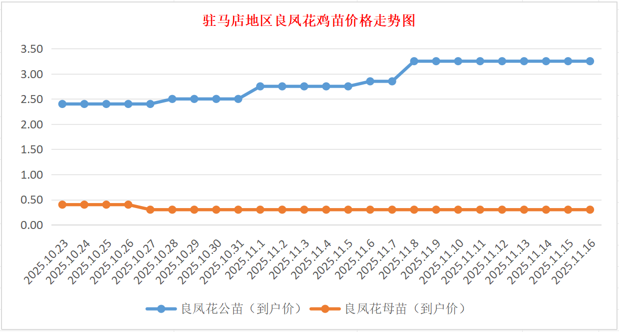 良凤花鸡苗:价格稳定,公苗到户价3.30-3.50元/羽,母苗到户价0.30元/羽,稳。