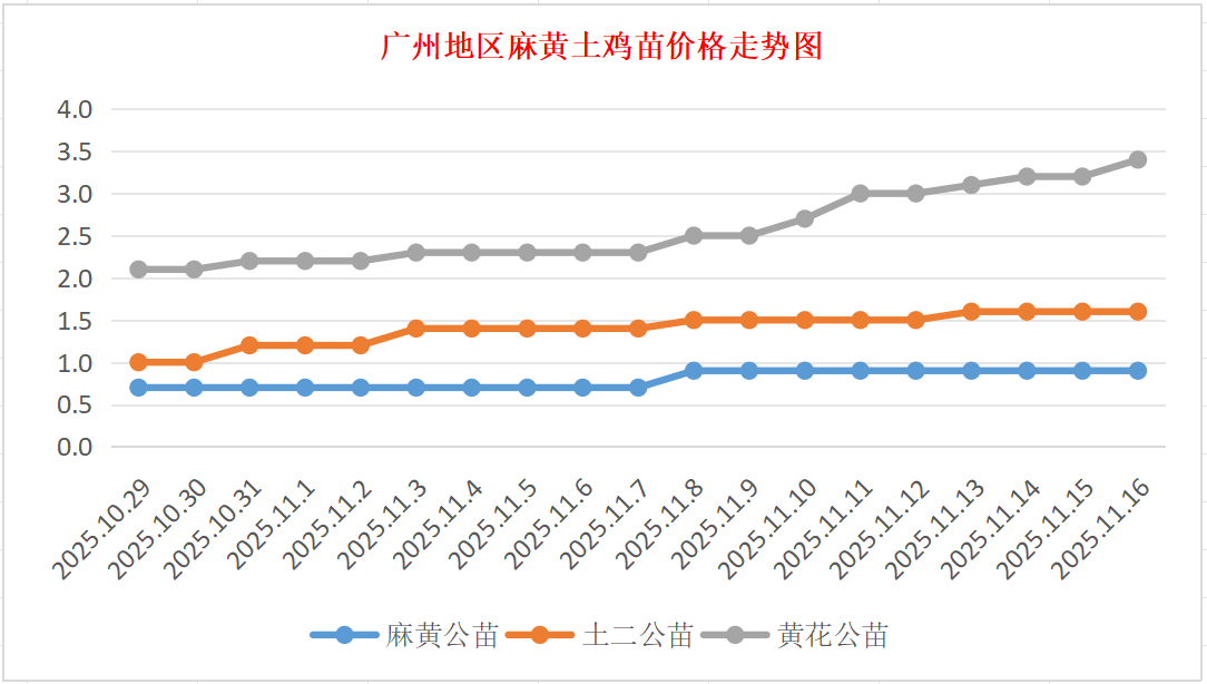 黄花公苗:价格上涨,竹料本地销售价3.40元/羽,涨。