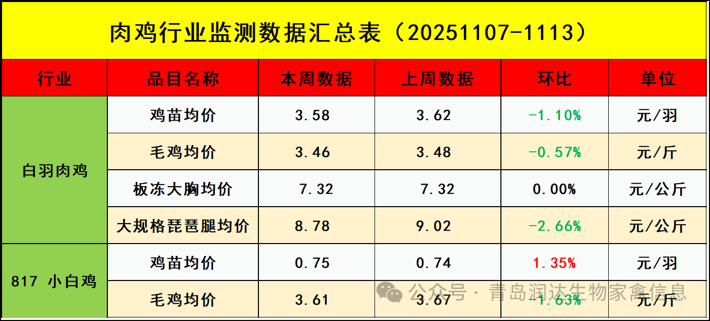 本周白羽肉鸡鸡苗周度均价3.58元/羽,与上周均价相比,下跌0.04元/羽,跌幅1.10%。