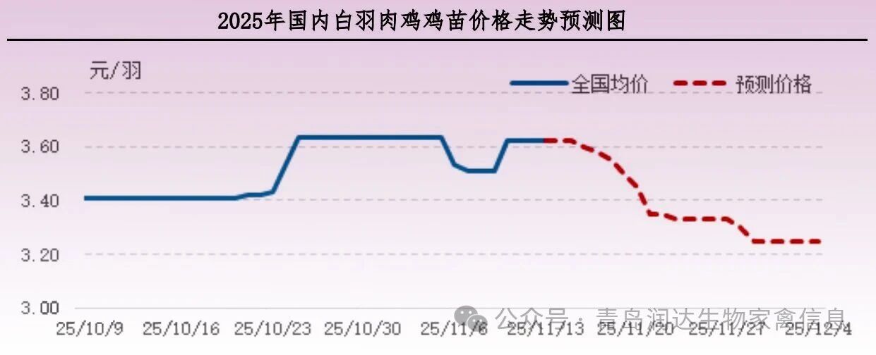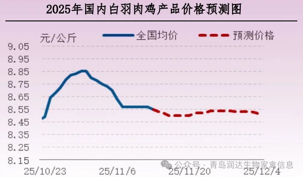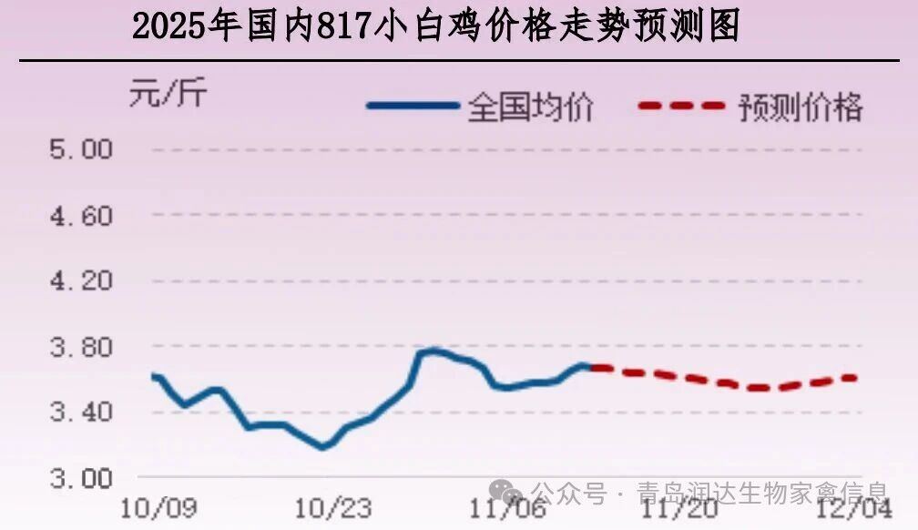 短期内毛鸡价格或偏弱运行,终端需求疲软,经销商补货积极性下降,产品库存提升,预计下周产品价格下滑。产品终端消化整体偏淡,当前社会鸡出栏体重略受减轻,大规格产品产量尚不充足,综合判断产品价格下跌空间有限。11月下旬,经销商低价补货,产品价格不乏小幅回升走势。11月末至12月初,市场交投疲软,产品价格或再度回落。