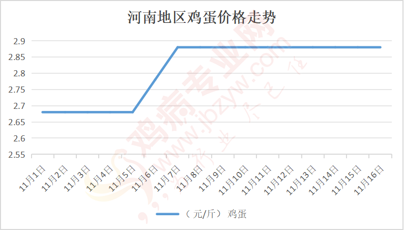 鸡病专业网消息:11月16日,河南郑州鸡蛋2.9元/斤,稳;新密鸡蛋2.9元/斤,稳;荥阳鸡蛋2.9元/斤,稳;中牟鸡蛋2.9元/斤,稳;周口鸡蛋2.85元/斤,稳;商丘鸡蛋87元/30斤,稳;鹤壁鸡蛋2.85元/斤,稳;汝州鸡蛋2.85元/斤,稳;开封鸡蛋86-87元/30斤,稳;漯河鸡蛋2.85元/斤,稳;漯河临颍鸡蛋2.85元/斤,稳;许昌鸡蛋2.9元/斤,稳;南阳鸡蛋2.85元/斤,稳;南阳邓州鸡蛋2.85元/斤,稳;新乡鸡蛋2.85元/斤,稳;安阳鸡蛋2.85元/斤,稳;新郑鸡蛋2.9元/斤,稳;登封鸡蛋2.9元/斤,稳;平顶山鸡蛋2.9元/斤,稳;驻马店鸡蛋2.9元/斤,稳;三门峡鸡蛋2.9元/斤,稳;焦作鸡蛋2.85元/斤,稳;信阳鸡蛋2.85元/斤,稳;濮阳鸡蛋2.85元/斤,稳。