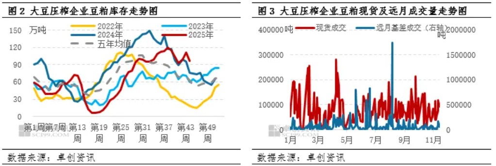 原料大豆整体充裕,支撑上游企业开工保持较高水平,市场现货货源供应宽松。卓创资讯监测数据显示,截至11月第1周,全国大豆压榨企业豆粕库存为96.30万吨,自年内高点有所下滑但仍高于往年同期水平。上游企业多数生产计划稳定,部分面临明显库存压力,全国范围内催提现象仍较为普遍,对豆粕现货价格形成一定压制。需求端来看,下游企业现货接货意愿较为谨慎,刚需滚动补库为主,部分头寸出现下滑,整体表现疲软。中旬开始,部分大豆压榨集团积极推进销售12-3月为主的远月基差组合,华东、华南地区平水价格成交,山东地区基差为20元/吨。市场中下游出于建立底仓、认可价格等原因成交情绪升温,11月10日-13日全国豆粕远月成交总量为44.80万吨。