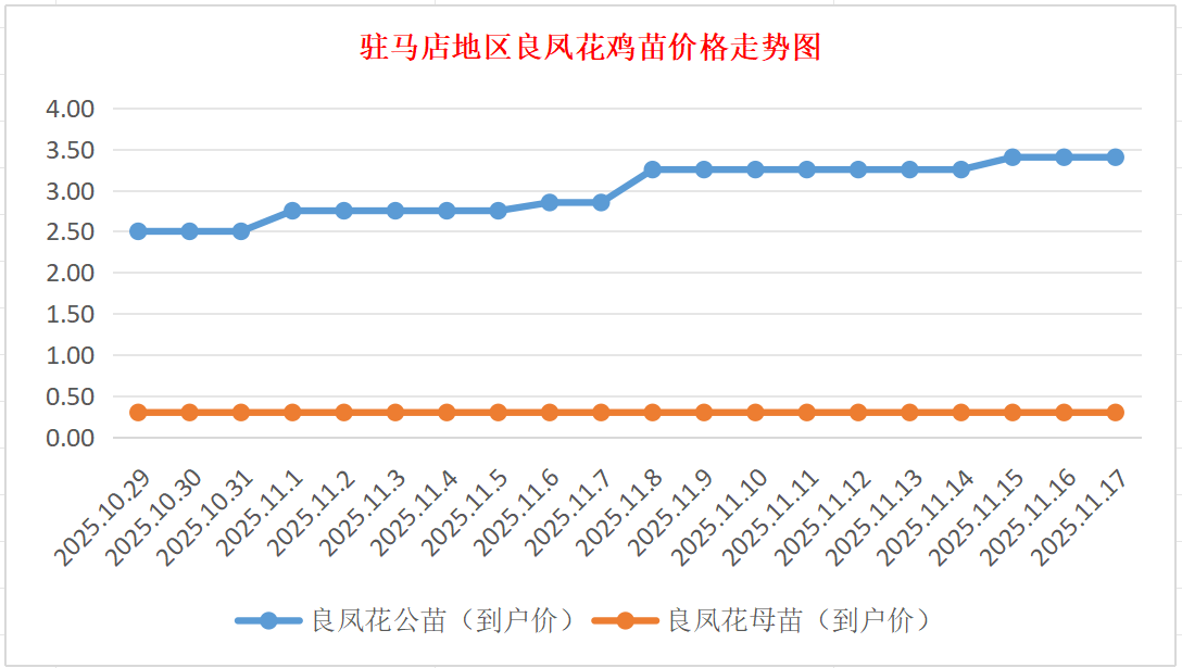 良凤花鸡苗:价格稳定,公苗到户价3.30-3.50元/羽,母苗到户价0.30元/羽,稳。