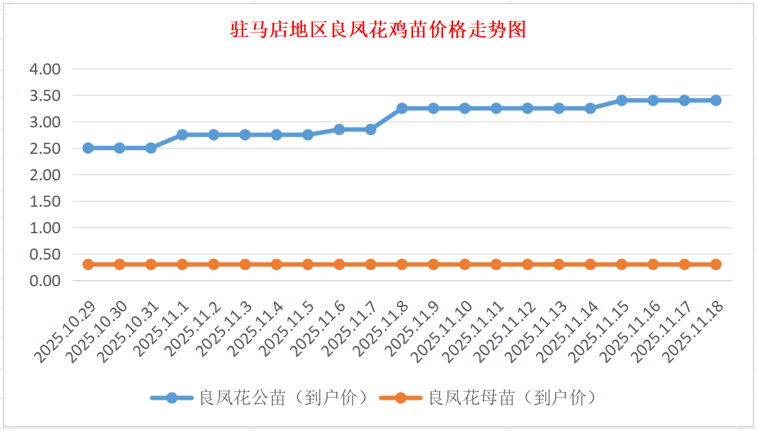 良凤花鸡苗:价格稳定,公苗到户价3.30-3.50元/羽,母苗到户价0.30元/羽,稳。