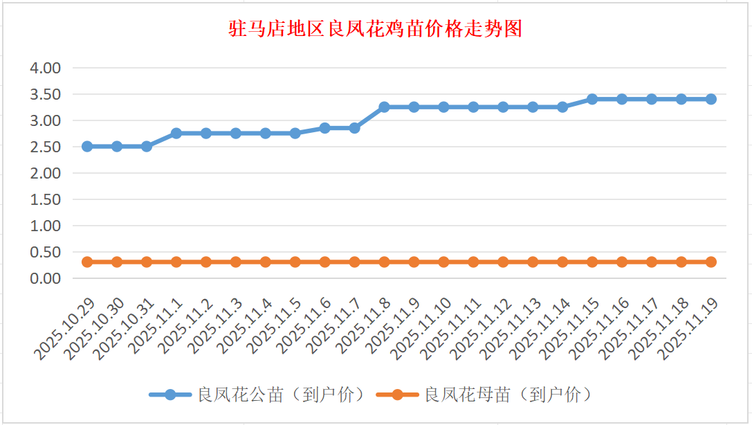 良凤花鸡苗:价格稳定,公苗到户价3.30-3.50元/羽,母苗到户价0.30元/羽,稳。