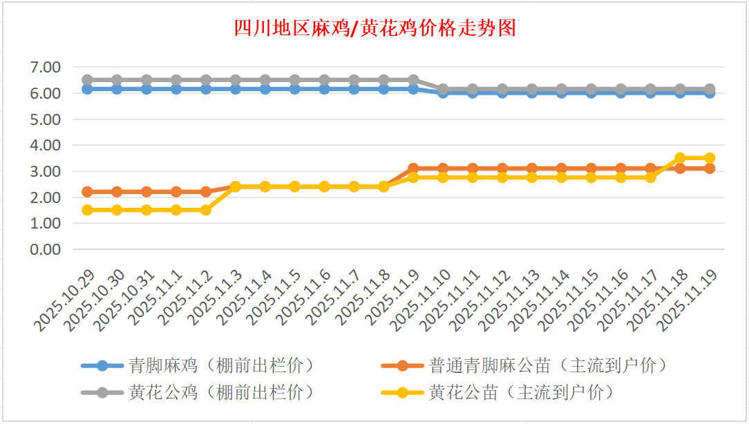 黄花公苗:价格稳定,主流到户价3.20-3.80元/羽,稳。