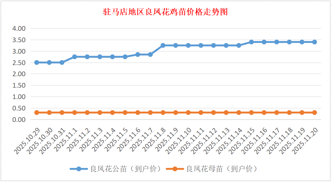 良凤花鸡苗:价格稳定,公苗到户价3.30-3.50元/羽,母苗到户价0.30元/羽,稳。