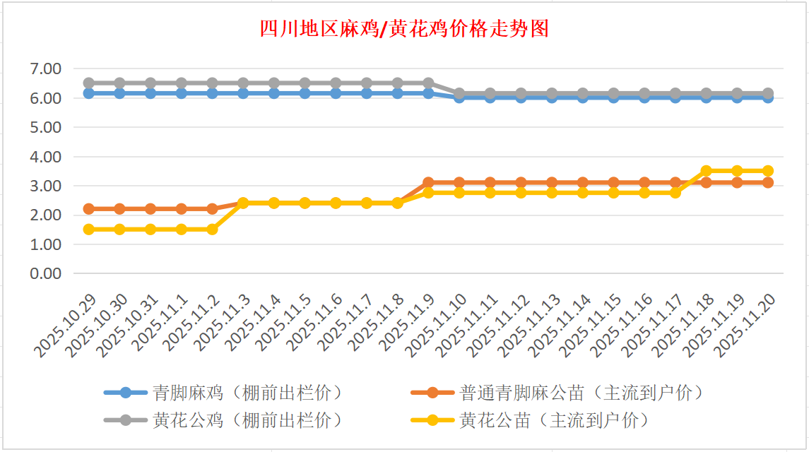 黄花公苗:价格稳定,主流到户价3.20-3.80元/羽,稳。