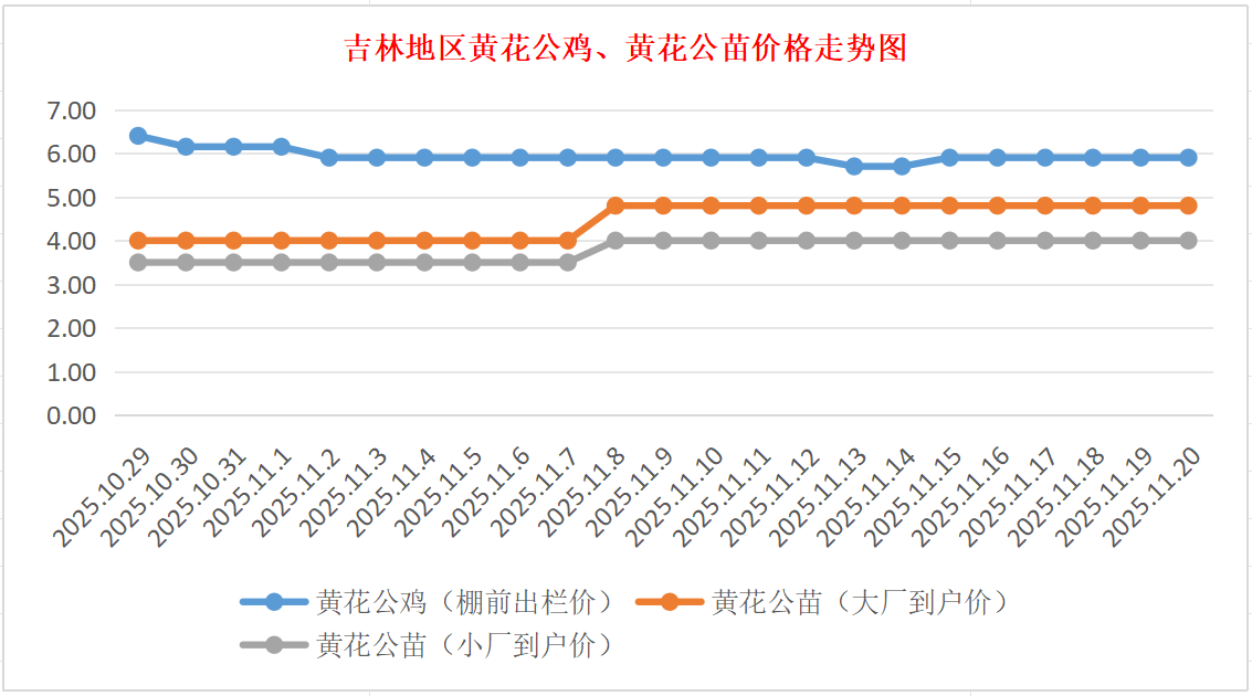 黄花公苗:价格稳定,大厂到户价4.80元/羽,小厂到户价4.00元/羽,稳。