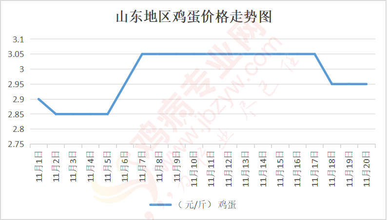 鸡病专业网消息:11月20日,山东地区莱阳鸡蛋2.95元/斤,稳;青岛鸡蛋2.95元/斤,稳;诸城鸡蛋3元/斤,稳;安丘鸡蛋2.9元/斤,稳;昌乐鸡蛋2.9元/斤,稳;寿光鸡蛋2.9元/斤,稳;昌邑鸡蛋2.9元/斤,稳;高密鸡蛋3元/斤,稳;青州鸡蛋2.9元/斤,稳;临朐鸡蛋2.9元/斤,稳;莱州鸡蛋2.95元/斤,稳;威海鸡蛋2.95元/斤,稳;临沭鸡蛋2.9元/斤,稳;沂水鸡蛋2.9元/斤,稳;沂南鸡蛋2.9元/斤,稳;莒南鸡蛋2.9元/斤,稳;兰陵县鸡蛋2.9元/斤,稳;日照鸡蛋2.9元/斤,稳;莒县鸡蛋2.9元/斤,稳;日照辛萁商贸鸡蛋2.9元/斤,稳;泗水鸡蛋价格84元/30斤,稳;济宁、汶上鸡蛋价格84元/30斤,稳;梁山、东平红蛋价格84元/30斤,稳;枣庄滕州地区鸡蛋混码主流到户86元/30斤,稳;泰安地区新泰鸡蛋价格84元/30斤,稳;菏泽地区曹县主流到户84元/30斤,稳;成武鸡蛋价格84元/30斤,稳;单县到户84元/30斤,稳;聊城莘县84元/30斤,稳。