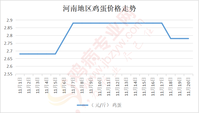 鸡病专业网消息:11月20日,河南郑州鸡蛋2.8元/斤,稳;新密鸡蛋2.8元/斤,稳;荥阳鸡蛋2.8元/斤,稳;中牟鸡蛋2.8元/斤,稳;周口鸡蛋2.75元/斤,稳;商丘鸡蛋84元/30斤,稳;鹤壁鸡蛋2.75元/斤,稳;汝州鸡蛋2.75元/斤,稳;开封鸡蛋83-84元/30斤,稳;漯河鸡蛋2.75元/斤,稳;漯河临颍鸡蛋2.75元/斤,稳;许昌鸡蛋2.8元/斤,稳;南阳鸡蛋2.75元/斤,稳;南阳邓州鸡蛋2.75元/斤,稳;新乡鸡蛋2.75元/斤,稳;安阳鸡蛋2.75元/斤,稳;新郑鸡蛋2.8元/斤,稳;登封鸡蛋2.8元/斤,稳;平顶山鸡蛋2.8元/斤,稳;驻马店鸡蛋2.8元/斤,稳;三门峡鸡蛋2.8元/斤,稳;焦作鸡蛋2.75元/斤,稳;信阳鸡蛋2.75元/斤,稳;濮阳鸡蛋2.75元/斤,稳。