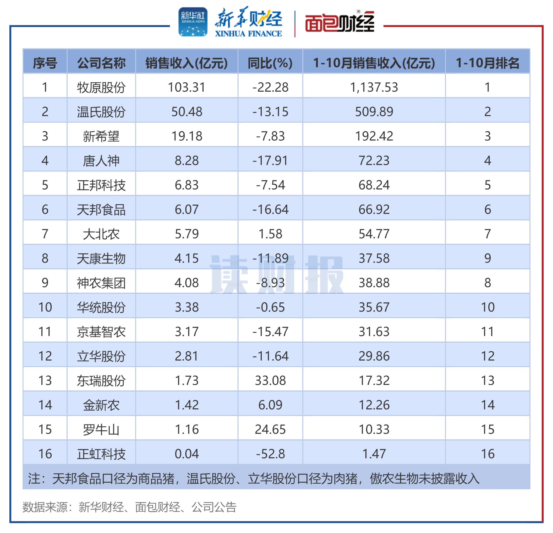 近期,生猪养殖企业10月的销售数据陆续披露。新华财经和面包财经研究员在剔除部分数据披露不全的上市猪企后,以沪、深两大交易所主要上市生猪养殖企业为样本,分别统计其生猪销售收入、销量。
