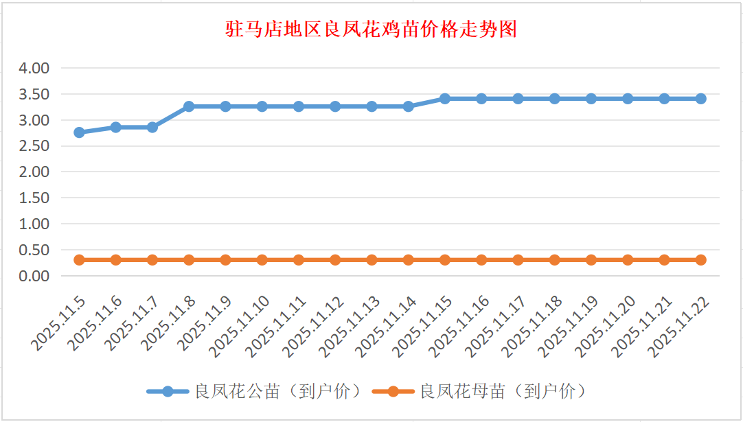 良凤花鸡苗:价格稳定,公苗到户价3.30-3.50元/羽,母苗到户价0.30元/羽,稳。