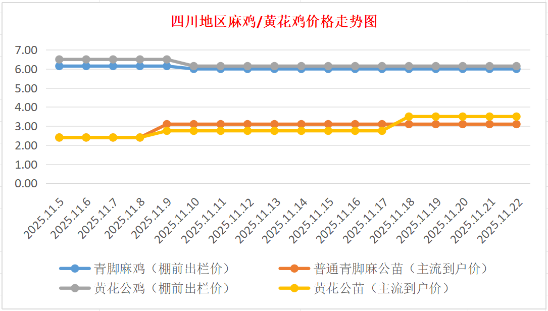 黄花公苗:价格稳定,主流到户价3.20-3.80元/羽,稳。