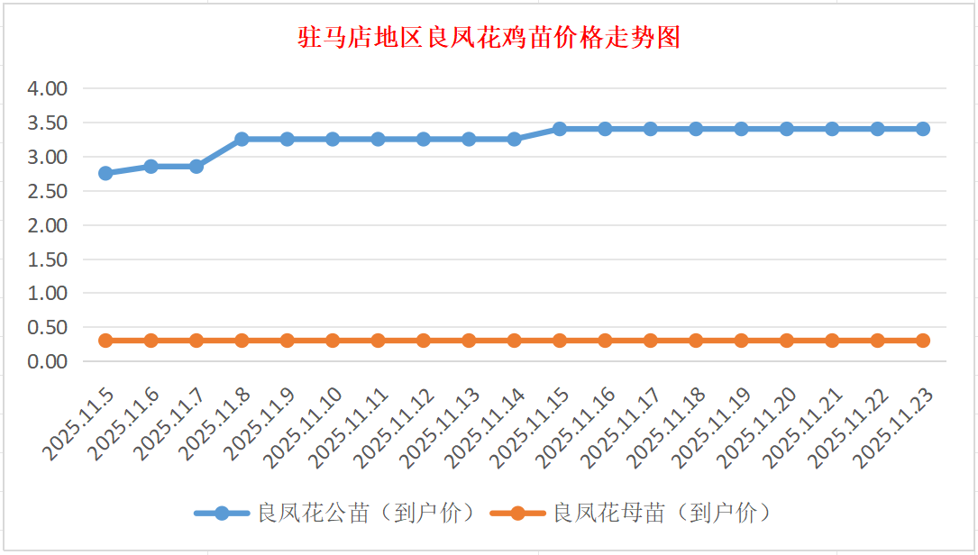良凤花鸡苗:价格稳定,公苗到户价3.30-3.50元/羽,母苗到户价0.30元/羽,稳。
