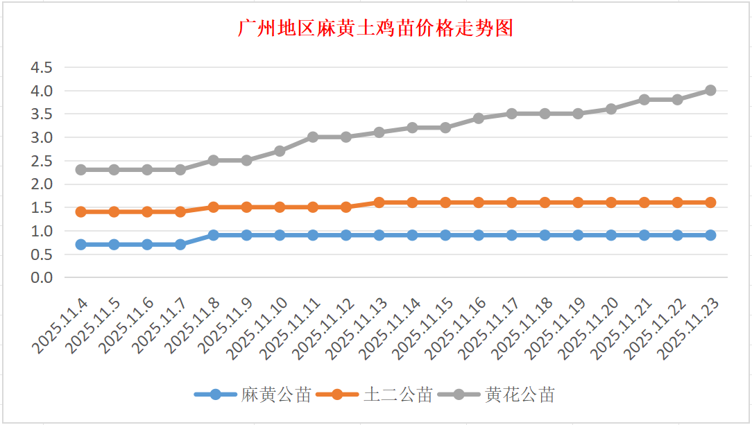 黄花公苗:价格上涨,竹料本地销售价4.00元/羽,涨。