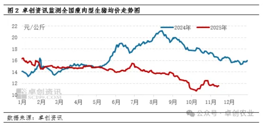 2025年生猪价格低位震荡后震荡下滑。截至11月20日,卓创资讯监测2025年全国瘦肉型生猪均价为14.04元/公斤,较2024年同期下跌16.72%。理论上,2025年生猪的出栏量是由2024年3月至2025年2月份的能繁母猪存栏量决定的,彼时养殖端正处于缓慢扩产阶段,能繁母猪存栏量增加,叠加母猪生产效率提升,对应2025年生猪出栏量增加,利空生猪价格。同时,2025年终端需求支撑欠佳,虽屠宰量同比增加,但鲜销市场支撑不足,屠宰企业收购生猪积极性较低,难以对猪价形成较强支撑。2025年猪价震荡下滑,二次育肥养殖户看涨信心降低,补栏行为减少,二次育肥热度下滑。
