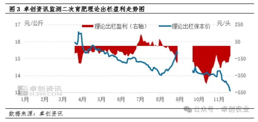 根据卓创资讯预计,11月下旬生猪市场行情或先降后涨,综合月内行情判断,11月份养殖盈利或呈小幅下滑后短暂回升的态势,月均值预计为-188.28元/头,环比减亏21.39元/头。