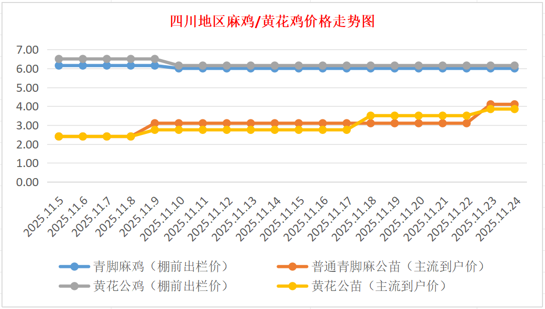 普通青脚麻公苗:价格稳定,主流到户价4.00-4.20元/羽,稳。