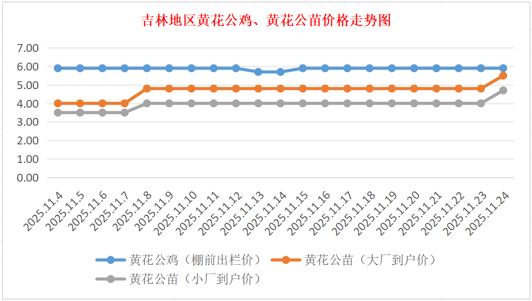 黄花公苗:价格上涨,大厂到户价5.50元/羽,小厂到户价4.70元/羽,涨。