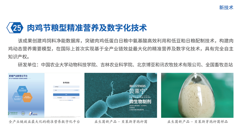 其中,由中国农业大学动物科技学院、吉林农业科学院、北京博亚和讯农牧技术有限公司、全国畜牧总站研发的“肉鸡节粮型精准营养及数字化技术”入选2025中国农业重大新技术。