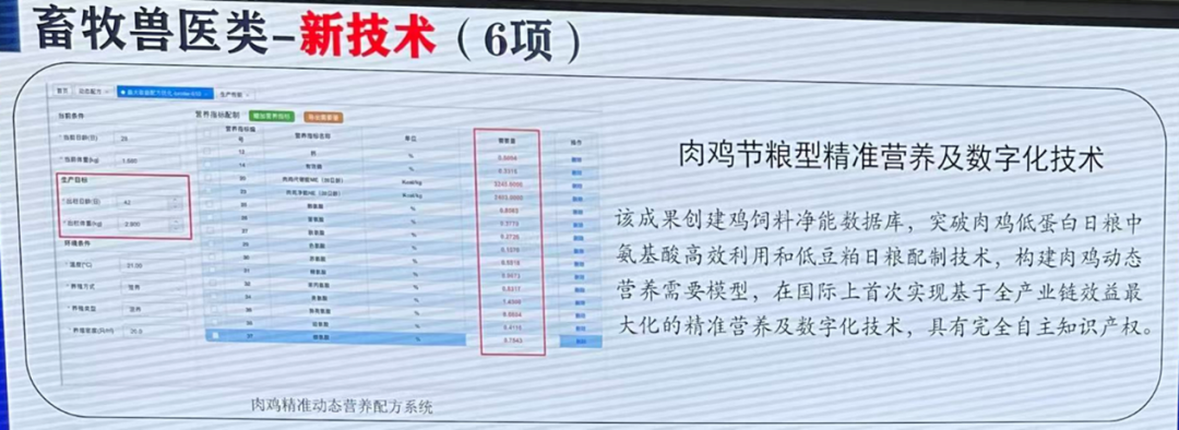 该成果入选,充分体现“四个面向”要求,技术创新突出,潜在经济社会生态效益显著。该成果以中国本土饲料原料营养数据库为基础,构建了鸡饲料净能数据库和肉鸡动态营养需要模型,通过饲料原料净能数据库、家禽营养需要量模型以及智能决策算法,实现饲料配方成本与养殖生产节奏的精准调控;同时对饲料厂生产部署数字化系统,对饲料工厂原料采购、生产销售等环节实时跟踪,结合智能环控养殖系统,保障养殖环境稳定,最终形成‘数据建模-配方优化-数字生产-风险对冲’全链条闭环,为养殖主体提供覆盖‘原料采购-配方优化-生产管理-市场决策'的全周期利润护航方案。