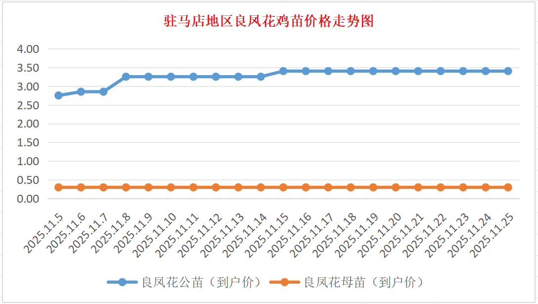 良凤花鸡苗:价格稳定,公苗到户价3.30-3.50元/羽,母苗到户价0.30元/羽,稳。