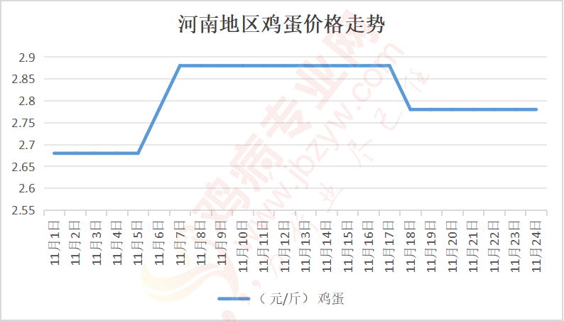 鸡病专业网消息:11月24日,河南郑州鸡蛋2.8元/斤,稳;新密鸡蛋2.8元/斤,稳;荥阳鸡蛋2.8元/斤,稳;中牟鸡蛋2.8元/斤,稳;周口鸡蛋2.75元/斤,稳;商丘鸡蛋84元/30斤,稳;鹤壁鸡蛋2.75元/斤,稳;汝州鸡蛋2.75元/斤,稳;开封鸡蛋83-84元/30斤,稳;漯河鸡蛋2.75元/斤,稳;漯河临颍鸡蛋2.75元/斤,稳;许昌鸡蛋2.8元/斤,稳;南阳鸡蛋2.75元/斤,稳;南阳邓州鸡蛋2.75元/斤,稳;新乡鸡蛋2.75元/斤,稳;安阳鸡蛋2.75元/斤,稳;新郑鸡蛋2.8元/斤,稳;登封鸡蛋2.8元/斤,稳;平顶山鸡蛋2.8元/斤,稳;驻马店鸡蛋2.8元/斤,稳;三门峡鸡蛋2.8元/斤,稳;焦作鸡蛋2.75元/斤,稳;信阳鸡蛋2.75元/斤,稳;濮阳鸡蛋2.75元/斤,稳。